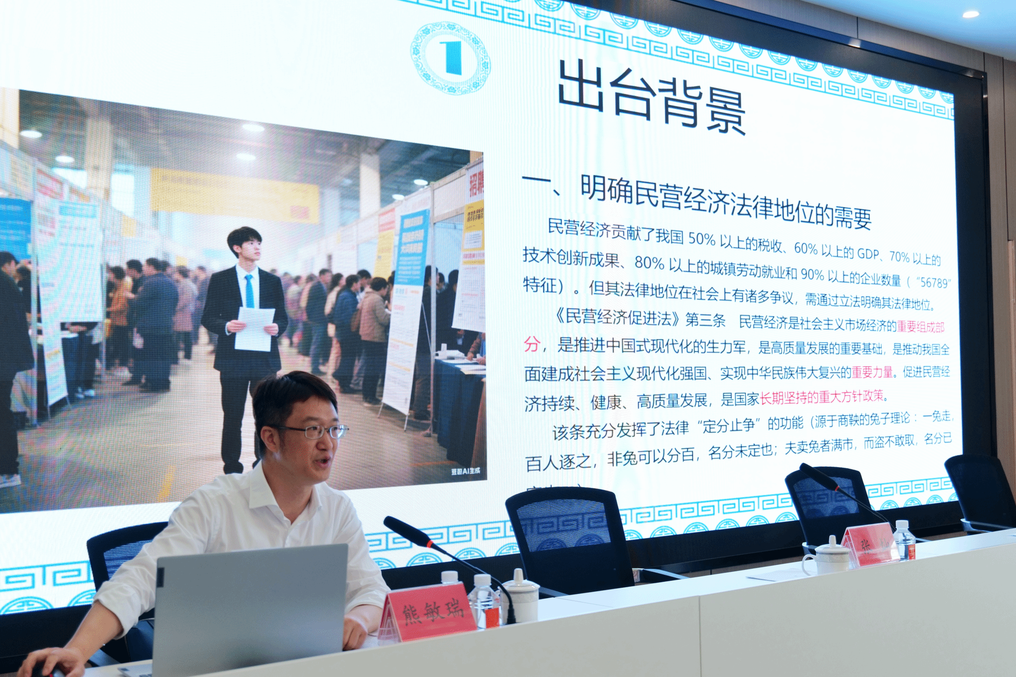 在一个多小时的讲座过程中,熊敏瑞博士从《中华人民共和国民营经济促进法》的出台背景、立法进程、重点法条解读等三个方面对《中华人民共和国民营经济促进法》进行了详细地讲解。