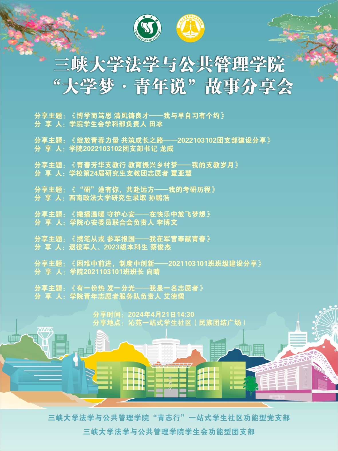 朋辈引航,共进成长。为充分发挥了朋辈典型在思想政治、学习科研、社会实践等方面的榜样引领作用,鼓励同学们从身边人、身边事中增智慧、长才干,培养学生坐下来能写、站起来能讲、走出去能干能力。三峡大学法学与公共管理学院“青志行”一站式学生社区功能型党支部、学院学生会功能型团支部决定举办“大学梦·青年说”故事分享会。现就故事分享会相关事宜通知如下: