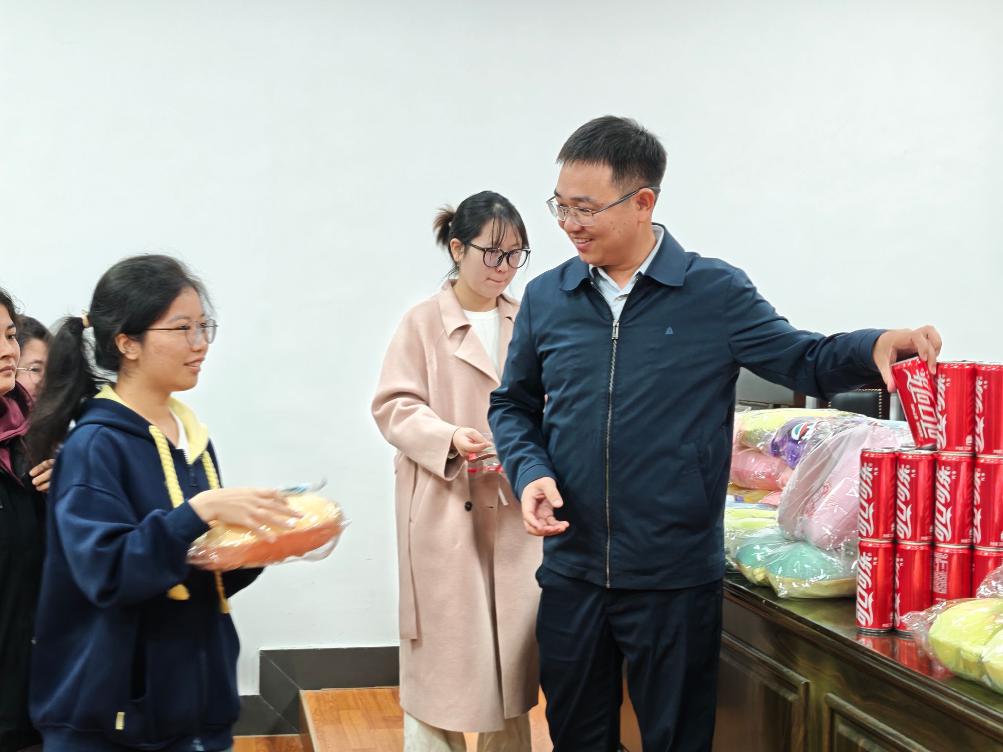 慰问过程中,赵伟忠肯定了同学们为梦想执著奋进的状态,鼓励同学们志存高远,既要树立清晰的目标,做好充分的准备,也要保持积极乐观的心态,勇于迎接挑战。他表示学院将始终作为同学们坚实的后盾,持续为大家提供优质的指导与服务,助力同学们实现梦想。随后,赵伟忠为同学们送上U型枕、文具套装、祝福可乐等慰问品,表达学校、学院对同学们的关心、祝福。