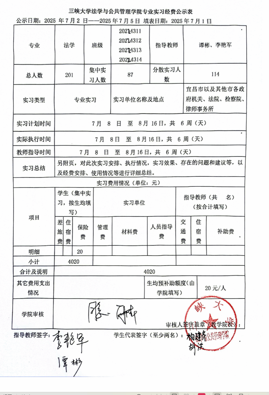 按照学校相关规定,现将2022级法学(科院)专业《专业实习》经费使用情况公示如下,对下列经费使用情况如有异议,于2025年7月5日17:00前以书面形式向学院教学办反映,过期不予受理。电话:0717-6398906。